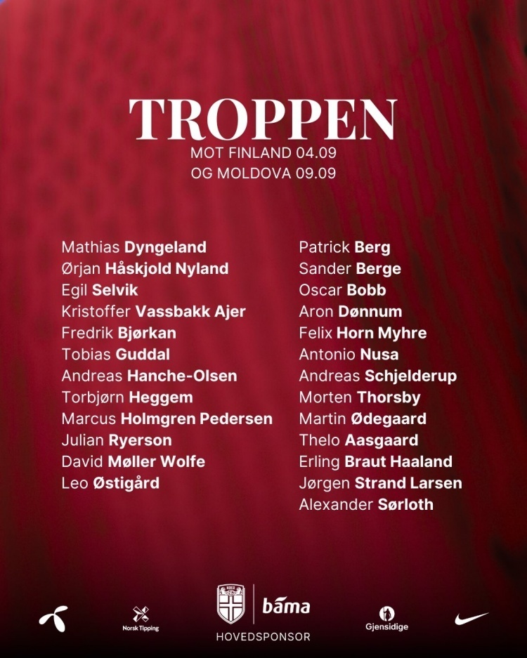 直播吧8月26日讯 挪威国家队公布9月份大名单,哈兰德、厄德高领衔。挪威将在9月份对阵芬兰(友谊赛)、摩尔多瓦(世预赛)。